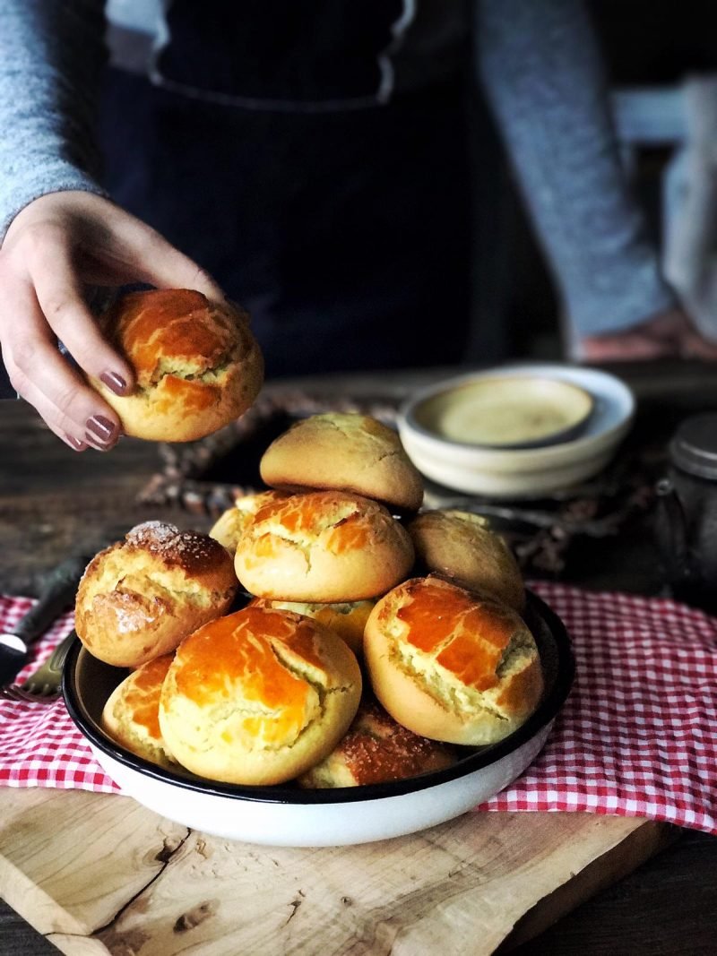 Tüm malzemeler karıştırılıp yumuşak ele yapışmayan bir hamur yapılır. Büyük eşit parçalar ile fırın tepsisine koyulur. Bir yumurta sarısı ile isteğe göre şeker konularak 180 derece  fırında derecede pişirilir. Fırını önceden ısıtmıyoruz,  fırını çalıştırıp maksimum 5 dk. sonra hemen tepsiyi  fırına koyuyoruz.