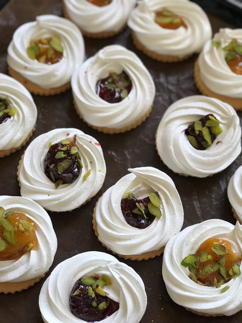 Üst mereng için; yumurta beyazı bir tutam tuz ile traş köpüğü kıvamı olana dek çırpılır. Üzerine yavaş yavaş şeker ekleyerek 8 dk. daha çırpmaya devam edilir. Sonra yıldız ucu sıkma poşetine mereng eklenir, soğumuş kurabiyelerin üzerine sıkılır. Önceden ısıtılmıs 100 derece fırında 50- 55 dk. pişirilir. Daha sonra iyice soğutulup üzerine istediğiniz  marmelattan koyabilirsiniz.