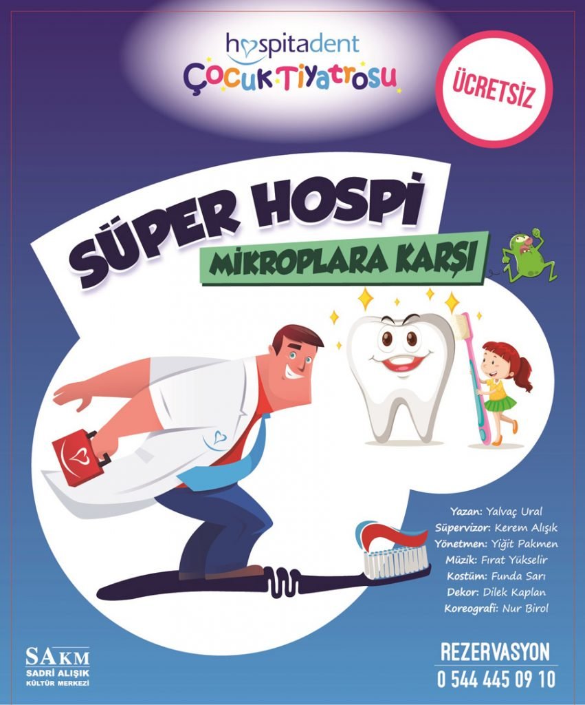 Hospitadent Diş Hastaneleri ve Sadri Alışık Kültür Merkezi işbirliği ile hazırlanan “Süper Hospi Mikroplara Karşı” adlı tiyatro oyunu, ağız ve diş sağlığının önemini eğlenceli bir şekilde minik seyircilere anlatmaya devam ediyor. Kerem Alışık’ın süpervizörlüğünü yaptığı, Yalvaç Ural’ın yazdığı ve Yiğit Pakmen’in yönettiği oyun, 21 Nisan Cumartesi günü Kadıköy’de, 22 Nisan Pazar günü ise Ataşehir’de minik seyircilerin beğenisine sunulacak. Minik izleyicilerine ağız sağlığı bilincini aşılamayı hedefleyen tiyatro, çocukları eğlendirmeyi de unutmuyor.